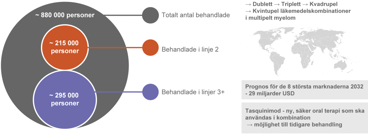 Marknaden för läkemedel vid behandling av multipelt myelom växer starkt och förväntas visa fortsatt god tillväxt som en följd av ökad incidens på grund av den högre förekomsten av en äldre befolkning, längre progressionsfri och total överlevnad och minskad dödlighet tack vare att nya behandlingar och kombinationsalternativ är tillgängliga. Av den bedömda totalmarknaden 2032 representerar USA cirka 68 procent, de fem största marknaderna inom EU cirka 20 procent samt Japan och Kina cirka 4 respektive 8 procent. (Global Data Report July 2024, Multiple Myeloma – Eight Market Drug Forecast 2022 – 2032).