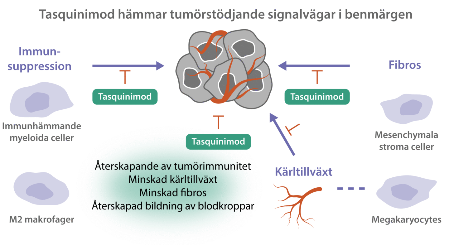 Tasquinimod är en oralt aktiv småmolekylär immunmodulator med ett nytt verkningssätt som blockerar tumörstödjande signaler i mikromiljön i benmärgen. Tasquinimod utvecklas för behandling av hematologiska cancerformer, med fokus på myelofibros.